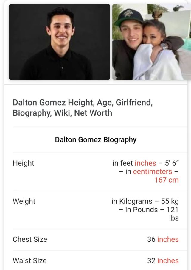 Gomez made his instagram private right as news broke of their dating, but grande does follow him. In february 2020, grande and gomez were seen kissing at a bar in northridge, los angeles. Dalton gomez ariana grande finance wiki, bio, age, height, nationality, engagement, instagram, and net worth. He is ariana grande's current husband. Since ariana grande is only three inches shorter than him, they make a visually appealing couple. Dalton jacob gomez (born august 7, 1995) is an american luxury real estate agent. Dalton gomez height, weight and body measurement. His birthday, what he did before fame, his family life, fun trivia facts, popularity rankings, and more. Likewise, dalton has been in the news since he is dating the extremely well known ariana grande. He may not be as wealthy as his girlfriend with his impressive net worth of. In march 2020, it was reported that they had been dating for two months. This man is 5 feet 6 inches, which equals 1 m 67 cm. 5 feet and 6 inches tall.
