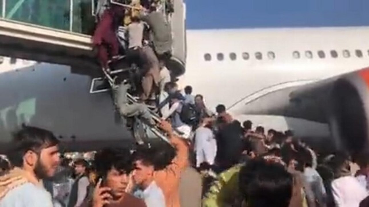A horde of people run towards the kabul airport terminal on august 16, 2021, in this still image taken from at least three people have been killed at kabul's airport as civilians attempt to escape from.